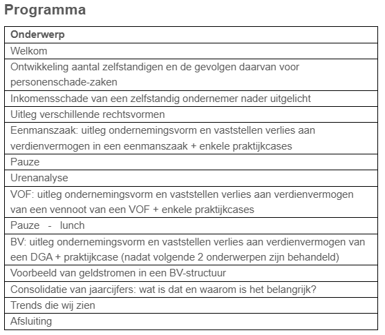 Het doel van de masterclass is ervaren schadebehandelaars, schade-experts en belangenbehartigers meenemen in het verhaal achter de cijfers, zodat zij in staat zijn om complexere personenschadezaken van zelfstandig ondernemers adequaat te behandelen.